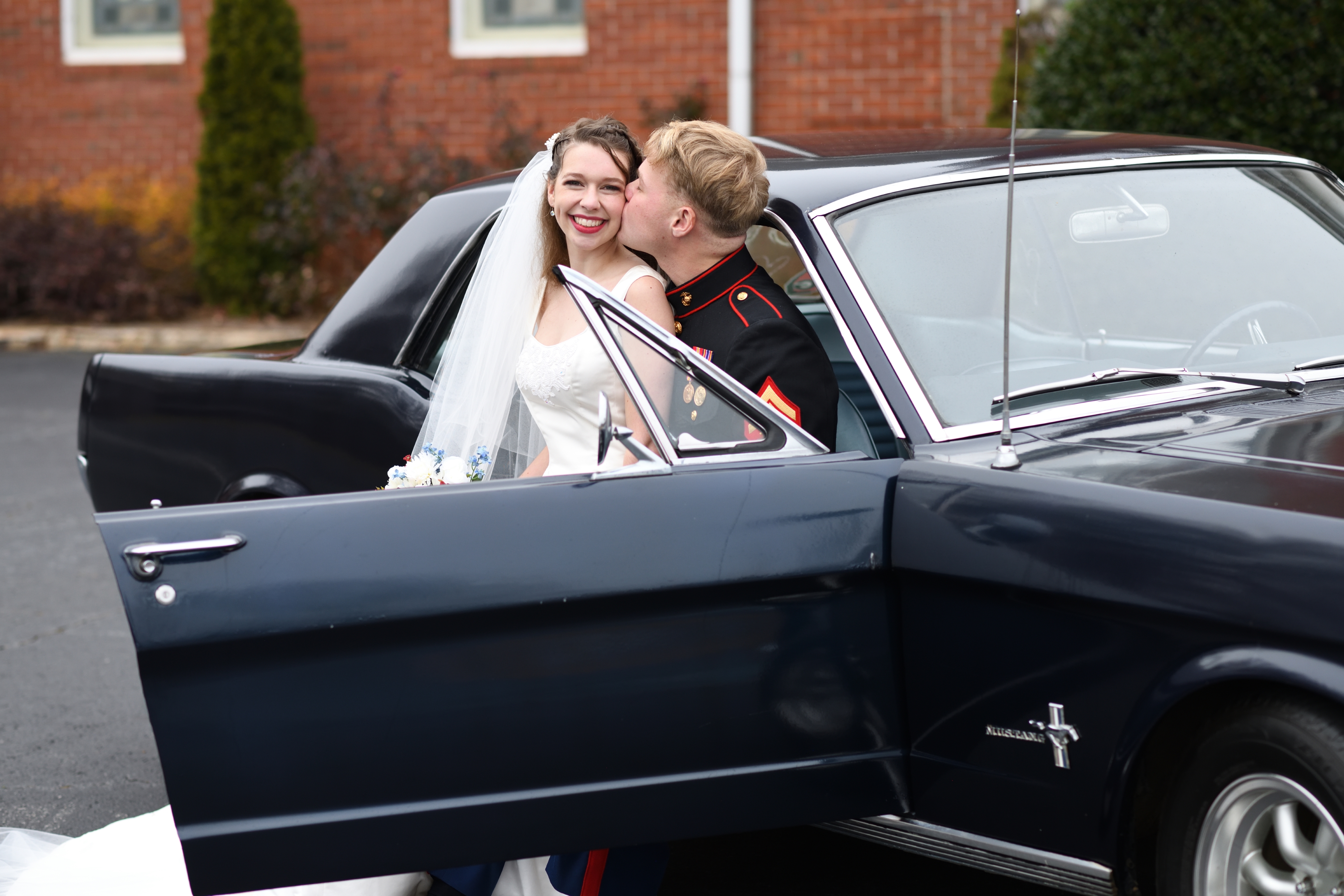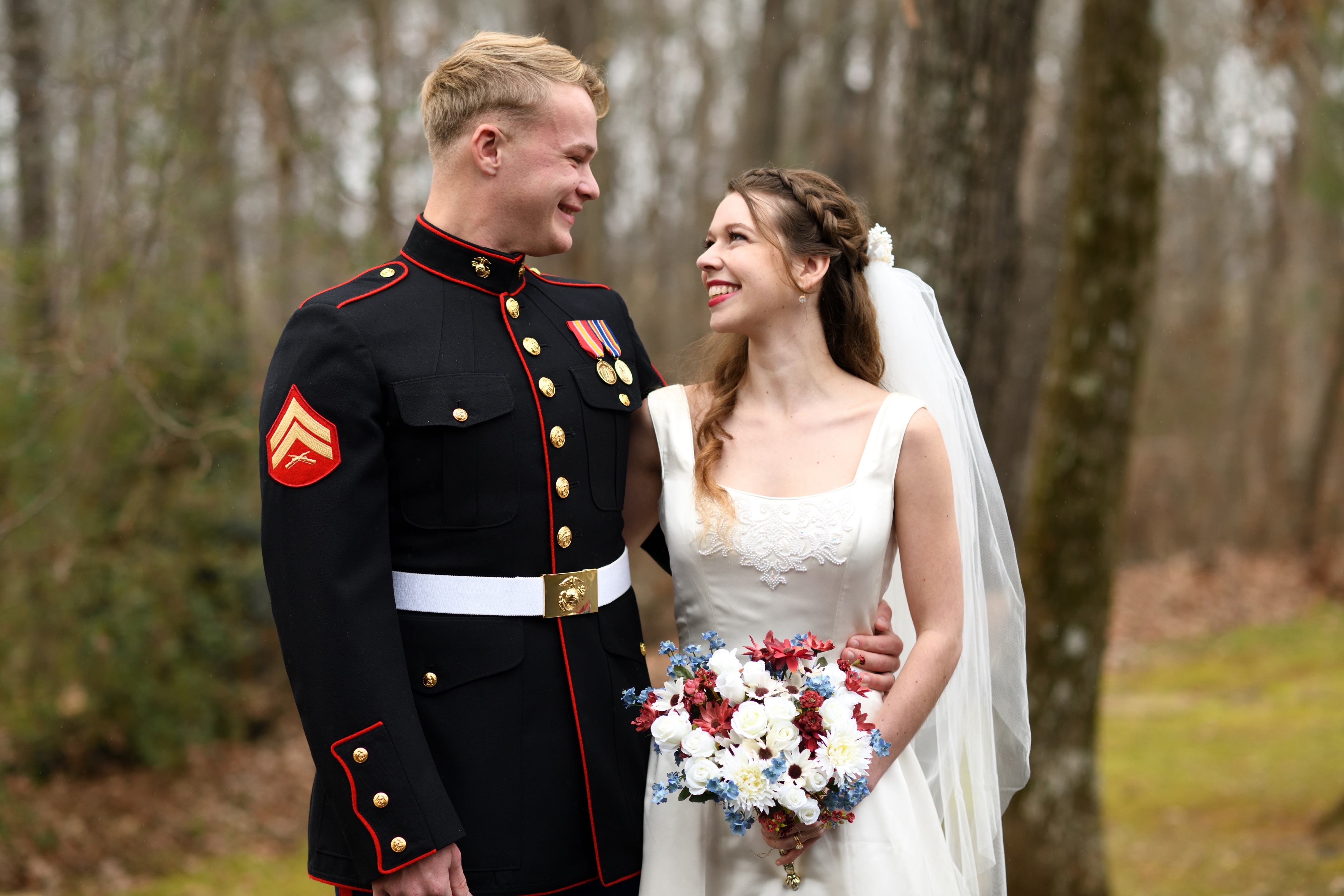 Georgia and Eli are madly in love. You can easily tell by the way they look at each other. This day was full of fun and it all started with their gorgeous attire. The groom decided to wear his dress blues and the bride wore a beautiful satin square neck wedding dress with the back having elegant fabric buttons for days. Georgia's bouquet was elegantly red, blue, and white themed matching with her crimson lip color. She chose to have a half-updo with a braid to show off her flowy brown hair. Georgia also opted for wedges instead of heels and I gotta say. . . smart girl!